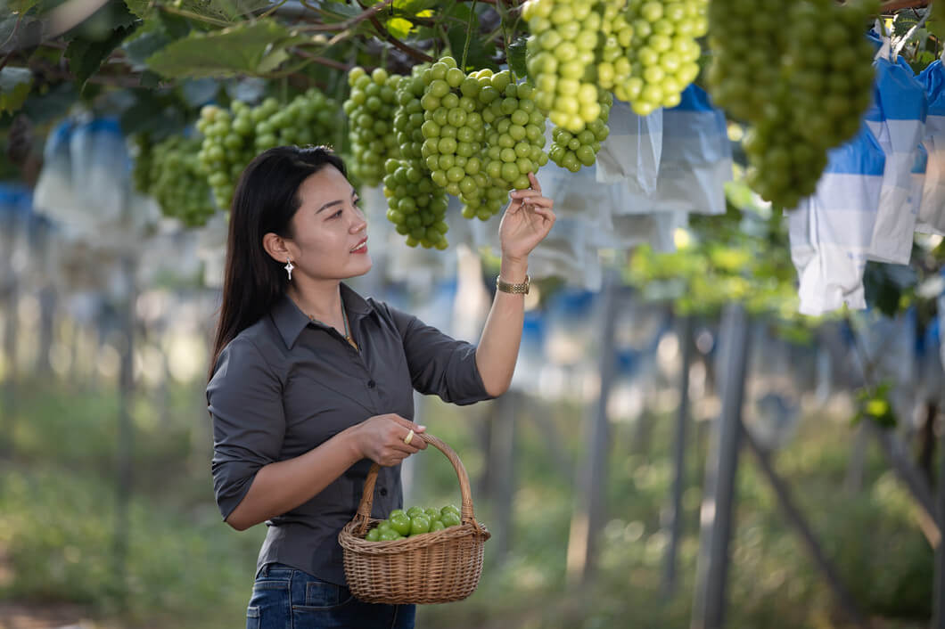 踏入园中,仿佛置身于葡萄的海洋。一串串饱满圆润的阳光玫瑰葡萄沉甸甸地挂满枝头,在阳光的照耀下,晶莹剔透,宛如绿宝石般璀璨夺目,还散发着淡淡的玫瑰香气,令人垂涎欲滴。游客们兴致勃勃地手持剪刀,穿梭在错落有致的藤架之间,精心挑选着心仪的果实,小心翼翼地剪下,放入篮中,脸上洋溢着丰收的喜悦。不少游客忍不住现场品尝,清甜多汁的口感瞬间在味蕾上绽放,大家纷纷竖起大拇指,赞不绝口。