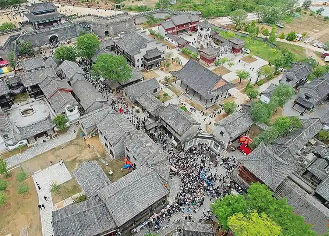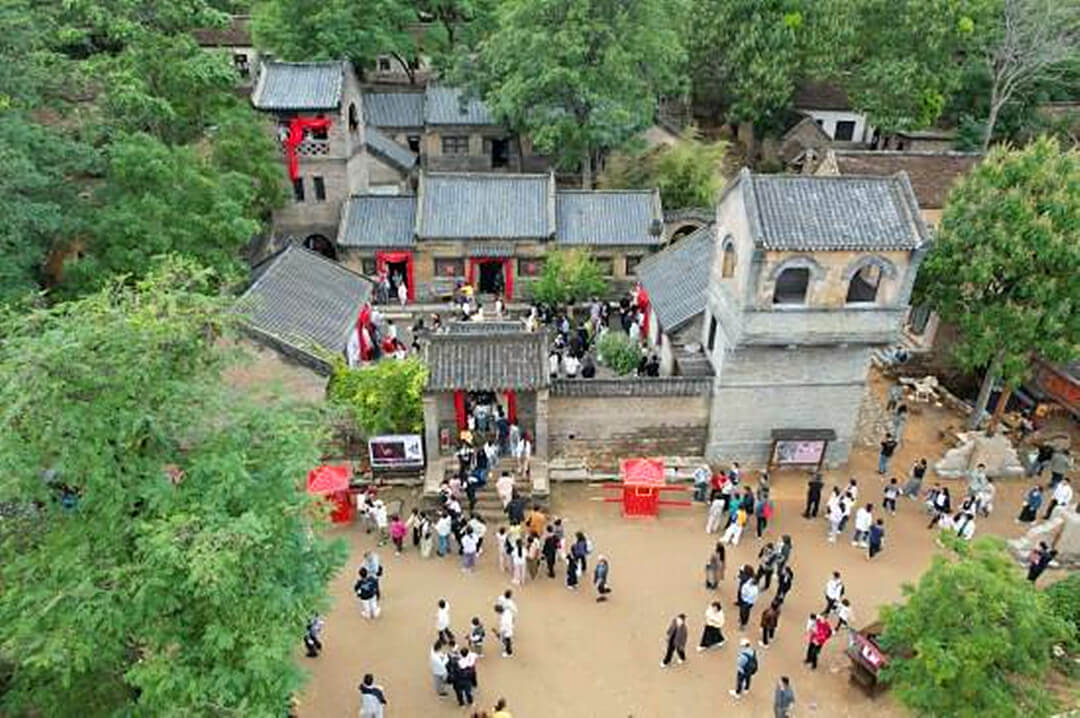 10月3日,在山东省沂南县马牧池乡常山庄村的山东红嫂家乡旅游区,游客在热播剧《生万物》取景地打卡(无人机照片)。