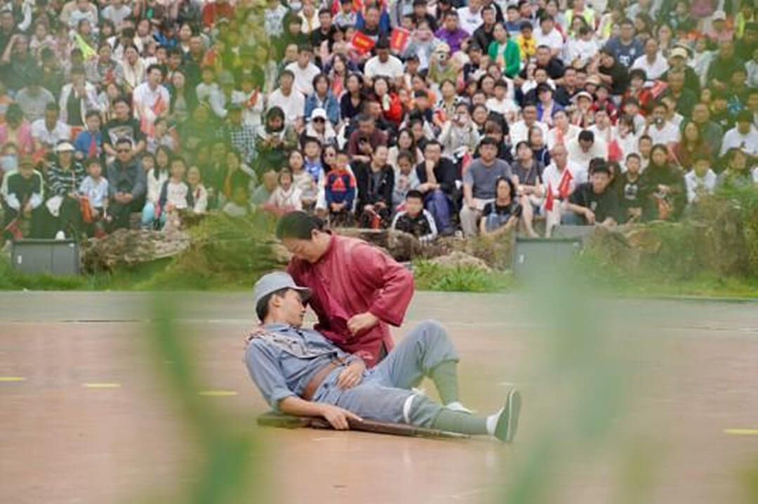 10月3日,在山东省临沂市沂南县常山庄村的山东红嫂家乡旅游区山村剧场,游客在观看舞台剧《火线桥》演出。