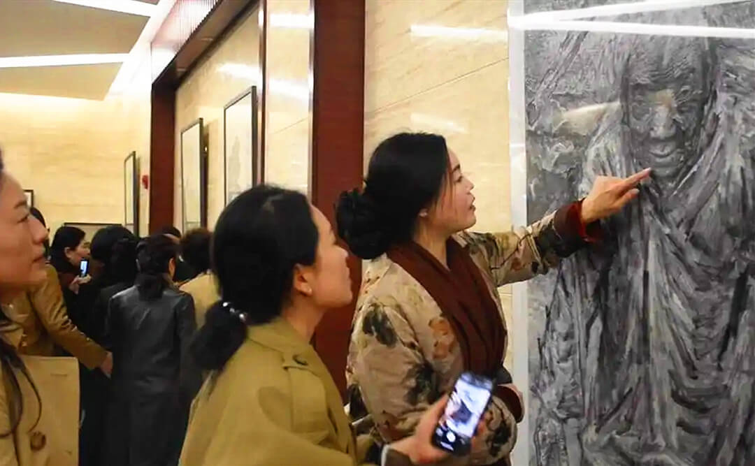 参观画展的来宾欣赏张立奎作品《沂蒙母亲》