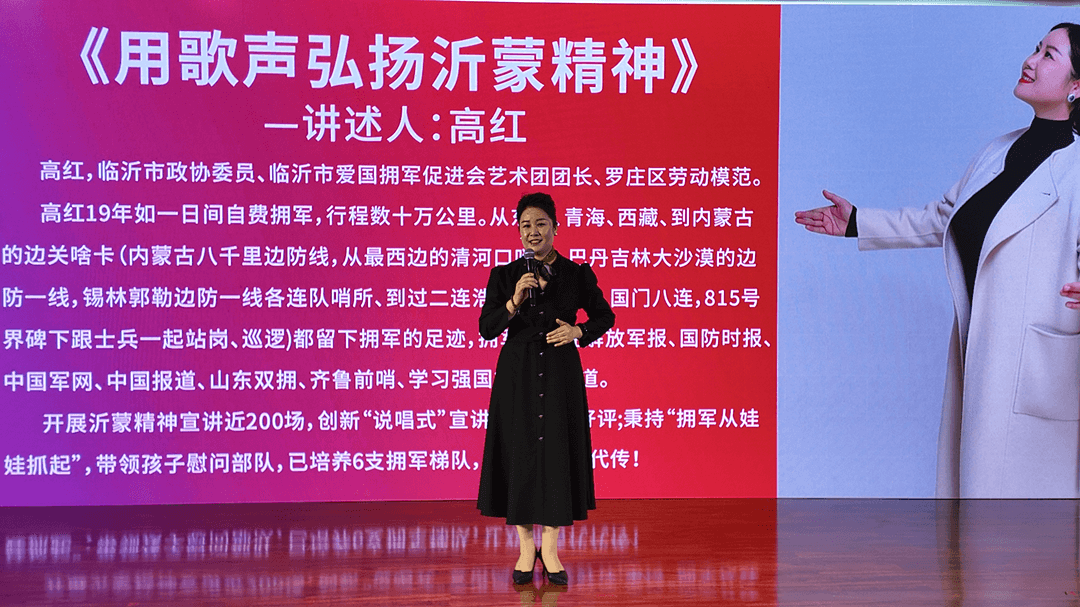 主题宣讲环节精彩纷呈,六项精品节目依次呈现:宣讲员乔利凤以《沂蒙有个传家宝》开篇,通过生动案例诠释沂蒙精神的当代价值;高红带来的《用歌声弘扬沂蒙精神》创新采用说唱形式,让红色故事焕发青春活力;金昇华讲述的《边境线上的“活界碑”》展现新时代戍边精神;张冬通过《血色母爱映沂蒙》深情讲述革命母亲的故事;刘国栋的《奉献》微宣讲引发强烈共鸣;最后,孟小婷以一曲《谁不说俺家乡好》将现场气氛推向高潮。