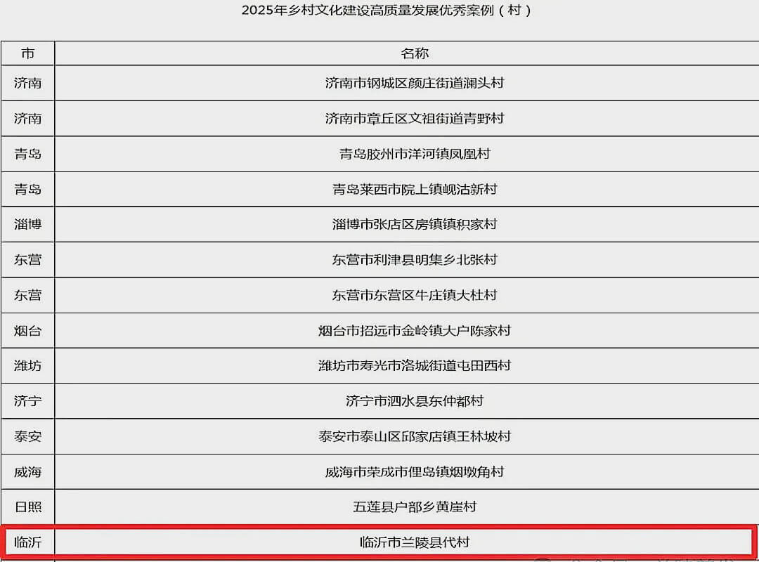 鲁南经济网讯 近日,山东省2025年乡村文化建设高质量发展优秀案例公布,共30个(镇10个、村20个)。临沂市兰陵县代村成功入选。