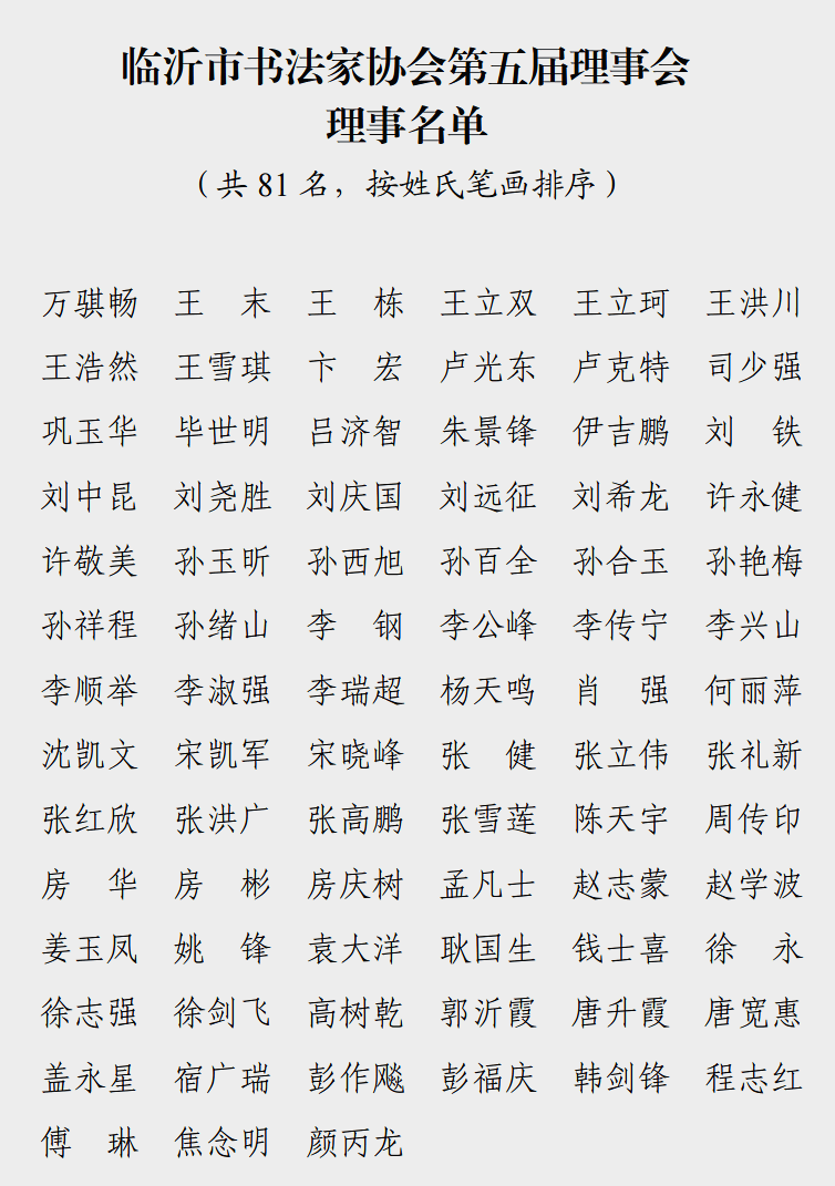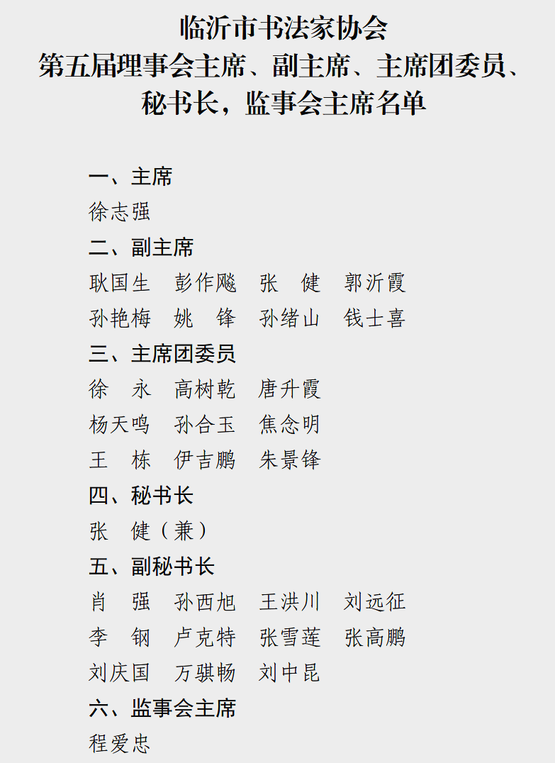 大会在庄严的国歌声中拉开帷幕。会上宣读了《市文联党组关于同意召开临沂市书法家协会第五次会员大会的批复》,龙岩致开幕词,姚东升宣读省书协贺信,张岚代表各市级文艺家协会致贺词,张荣磊代表第四届理事会作工作报告,徐志强就《临沂市书法家协会章程》的修改情况作说明,张健宣读《财务管理办法》,耿国生同志宣读选举办法,于泳重申《严明换届纪律“十条禁令”》,张以刚就新一届书协领导班子组成情况作说明。大会严格履行选举程序,选举产生了新一届理事、监事,理事会主席、副主席、主席团委员,秘书长、监事会主席。