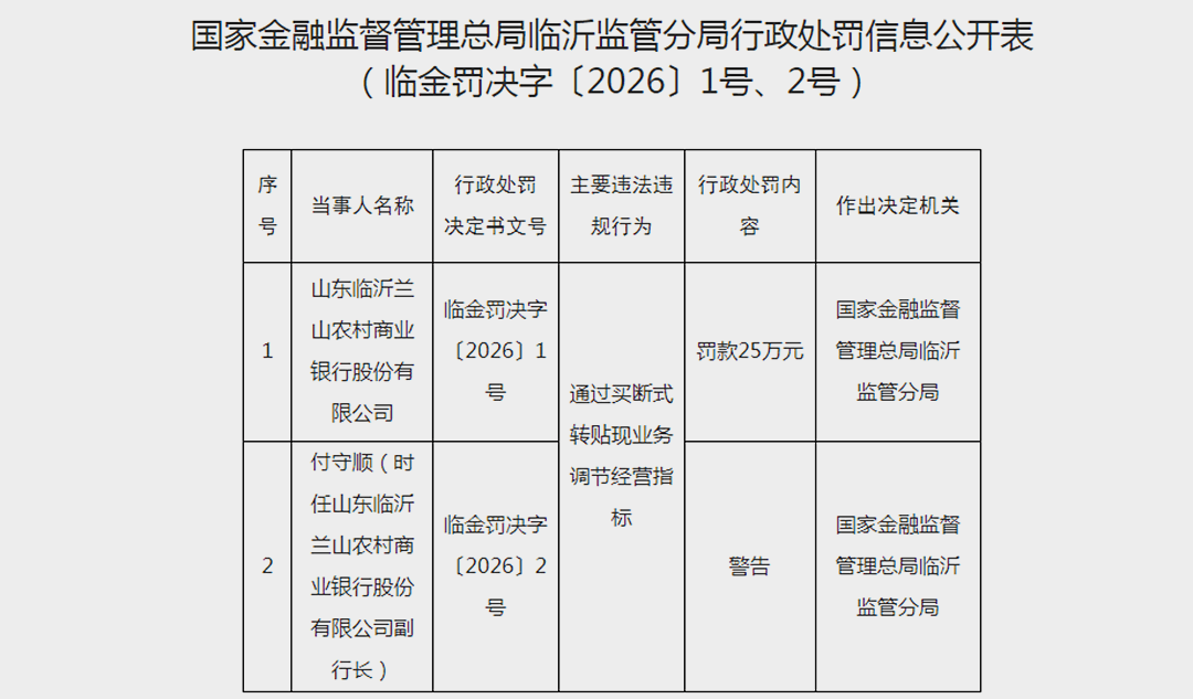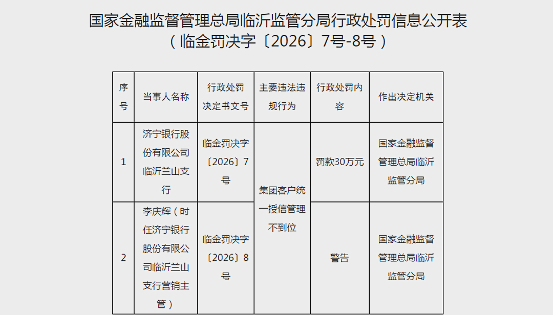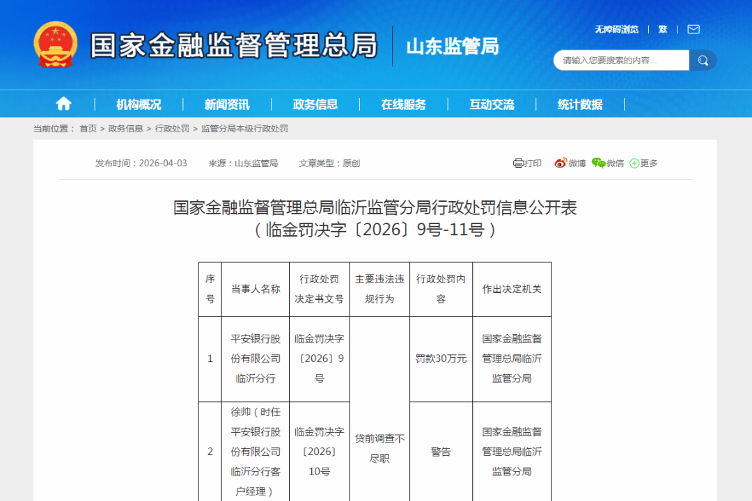 近日,平安银行股份有限公司临沂分行、山东临沂兰山农村商业银行股份有限公司、济宁银行股份有限公司临沂兰山支行等多家银行,分别由于贷前调查不尽职、通过买断式转贴现业务调节经营指标和集团客户统一授信管理不到位等违法违规行为被国家金融监督管理总局临沂监管分局分别处以罚款30万元及警告、罚款25万元及警告、罚款30万元及警告的处罚。