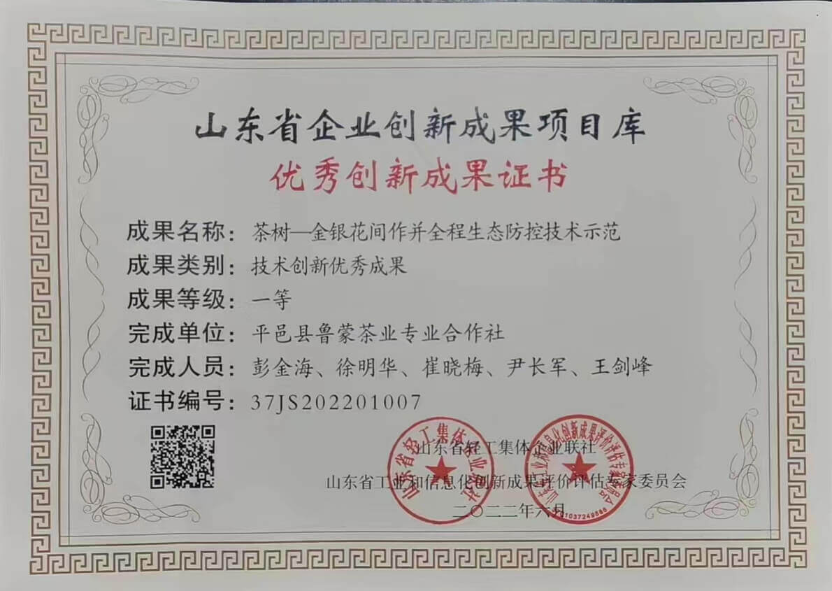 2014年鲁蒙茶业成功研发金银花红茶“邑城红”,开创金银花发酵茶历史先河。第五届沂蒙优质农产品交易会“邑城红”被评为“最喜爱的金奖农产品”,“鲁蒙金银花红茶茶饼系列”在2018首届临沂文创旅游产品大赛中荣获金奖。中国农业品牌研究中心发布《2025中国茶叶企业产品品牌价值评估结果》,“鲁蒙”商标价值7664.64万元,“邑城红”商标价值3518.67万元。2021年鲁蒙茶业联合临沂市食品工业协会制定并发布《沂蒙山金银花红茶》等四部团体标准及加工规程,均为全国金银花茶行业第一部可引用执行的团体标准,为金银花产业的提升发展做出了贡献。2024年鲁蒙“邑城红”代表“平邑金银花”入选山东省文化和旅游厅“好客山东·好品山东”农产品类TOP10旅游必购品,并于同年获得绿色食品认证,2025年荣获“全省乡村特色产业名优产品”。