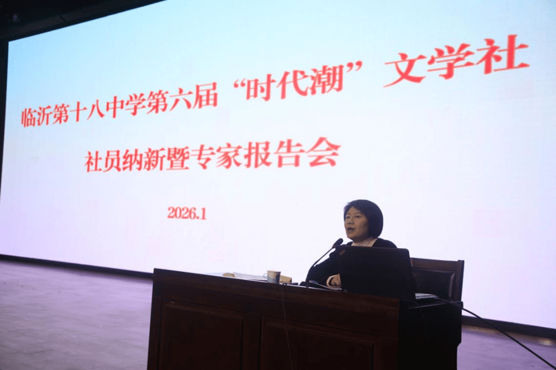 鲁南经济网讯 2026年1月18日上午,临沂第十八中学第六届“时代潮”文学社纳新暨专家报告会在学校餐厅三楼大礼堂隆重举行。本次活动由临沂第十八中学党委委员、副校长姜良威主持,来自《散文海外版》编辑部主任、执行主编王燕教授,临沂市文联党组成员、副主席于泳,中国作协会员、山东省作协主席团委员、临沂市作家协会主席张岚,罗庄区委常委、宣传部部长、区教育工委书记李婷,罗庄区教育工委常务副书记、区教育局党组书记、局长刘文峰,罗庄区文联党组书记、主席张付华,中国作协会员、市作协诗词创作委员会主任刘存玲,罗庄区作家协会主席李桂龙等领导嘉宾出席活动。临沂第十八中学党委副书记、副校长李志国及部分党委成员、教师代表,高一、二年级文学社成员和2026级自主招生学生500余人参加活动。