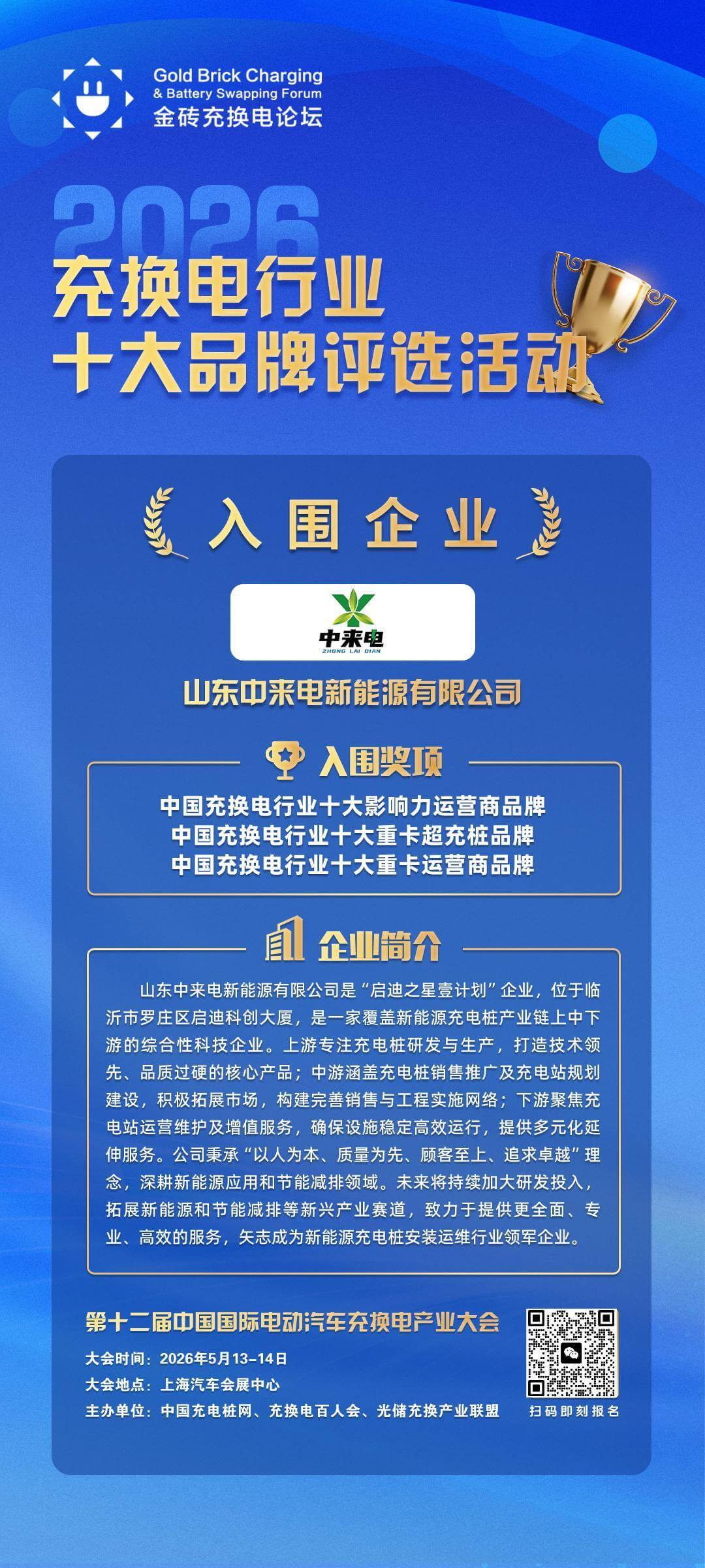 鲁南经济网讯 近日,在2026中国国际充换电行业十大品牌评选活动中,山东中来电新能源有限公司凭借超强的技术与产品优势成功入围,并获得中国充换电行业十大影响力运营商品牌、中国充换电行业十大重卡超充桩品牌、中国充换电行业十大重卡运营商品牌三大奖项。