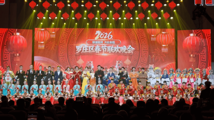 鲁南经济网讯 盛世欢歌启新篇,马踏祥云报春来。2月10日晚,罗庄区2026年春节联欢晚会举行。晚会以“骐骥驰骋 共赴新程”为主题,通过四大篇章、17个精品节目的艺术呈现,全景式展现罗庄区高质量发展的辉煌成就,凝聚起全区人民昂扬奋进的磅礴力量。王鑫、张强、彭有聚、夏洪成、刘克区、李婷等区级班子领导与优秀党员代表、身边好人等社会各界人士欢聚一堂,共迎新春佳节。