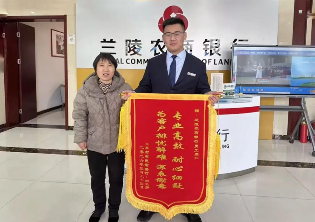 鲁南经济网讯 3月23日,客户刘女士专程来到兰陵农商银行矿坑支行,将一面印有“专业高效 耐心细致 为客户排忧解难 深表谢意”的锦旗,郑重地送到了大堂助理周知的手里,并不住地道谢。